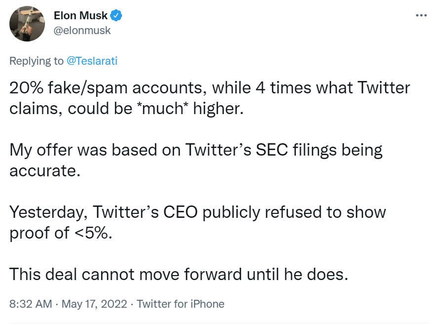 "My offer was based on Twitter's SEC filings being accurate," Musk said. "Yesterday, Twitter's CEO publicly refused to show proof of <5%. This deal cannot move forward until he does."