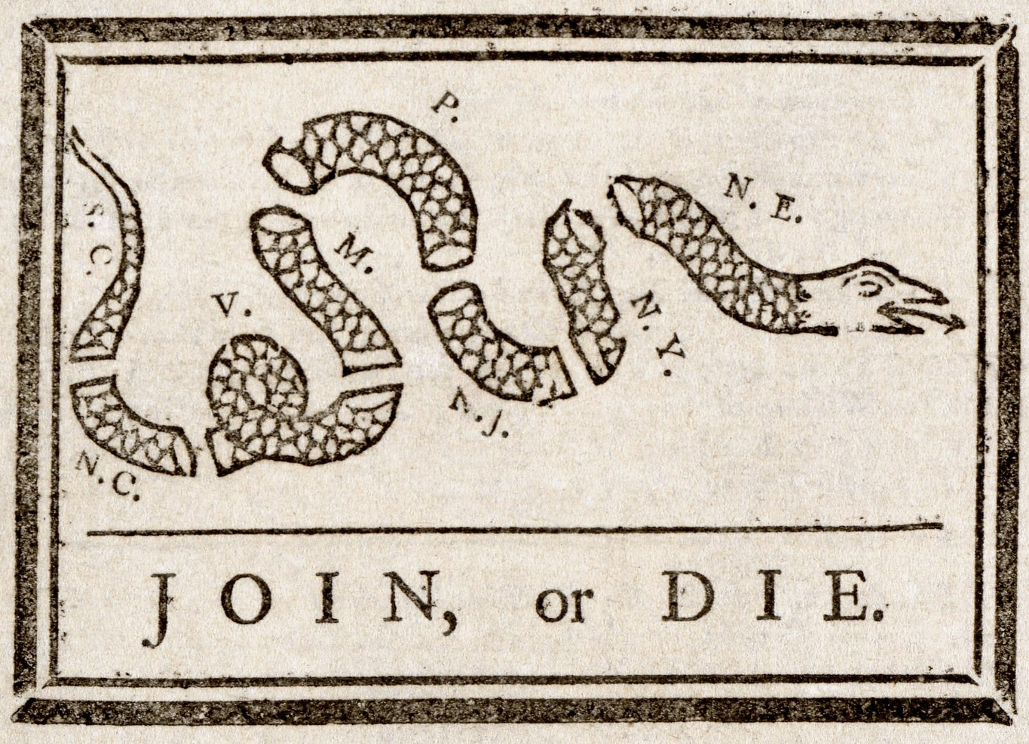 It’s original purpose was to urge the colonies to unite against French forces and Native Americans. It was later repurposed during the American Revolution.