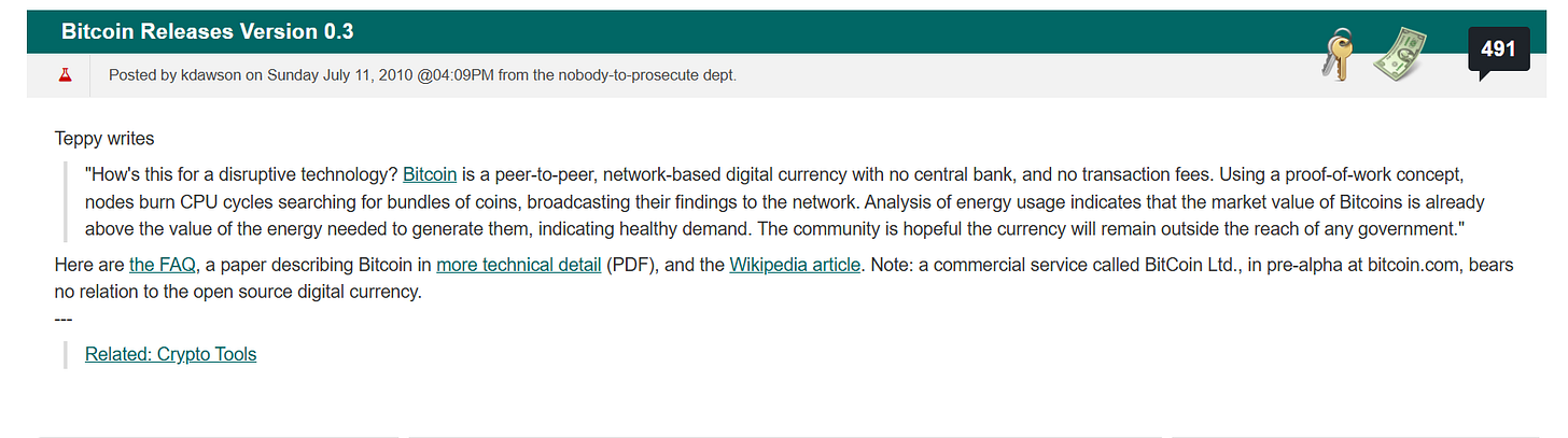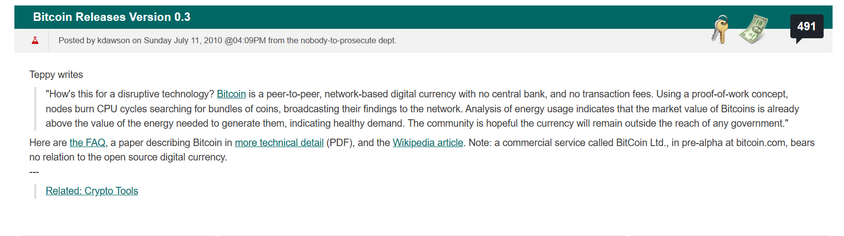 Though Bitcoin’s price was just around $0.10, further interest in the project grew thanks to posts on Reddit (link) and community-driven sites literally giving away Bitcoins (link).